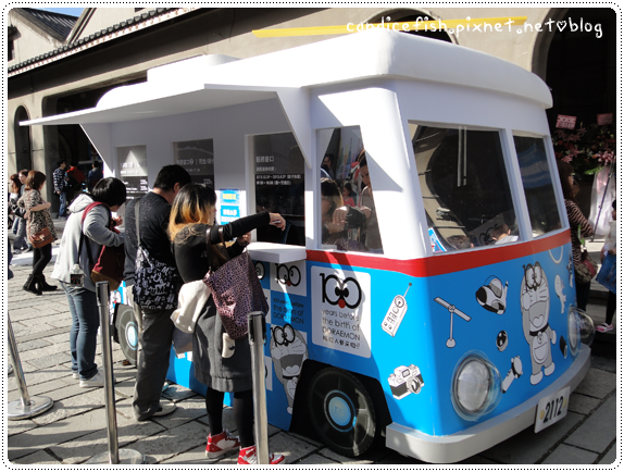 年末連假的第一天,也是哆啦A夢特展的首日,原本以為今天會有寒流,沒想到完全相反!人潮每每都跟天氣成正比,今天的隊伍果然是又長又遠,三個人在豔陽下曬了快一小時才解脫。售票亭很可愛,是台有著竹蜻蜓的車子;現場買票似乎有送紙眼鏡,不過票價比我們買的預售票$150貴了70元。