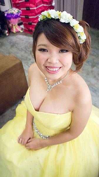 而二次進場的敬酒禮服,是Fina建議君挑選的嫩黃色蓬裙,很像君給我的感覺~
